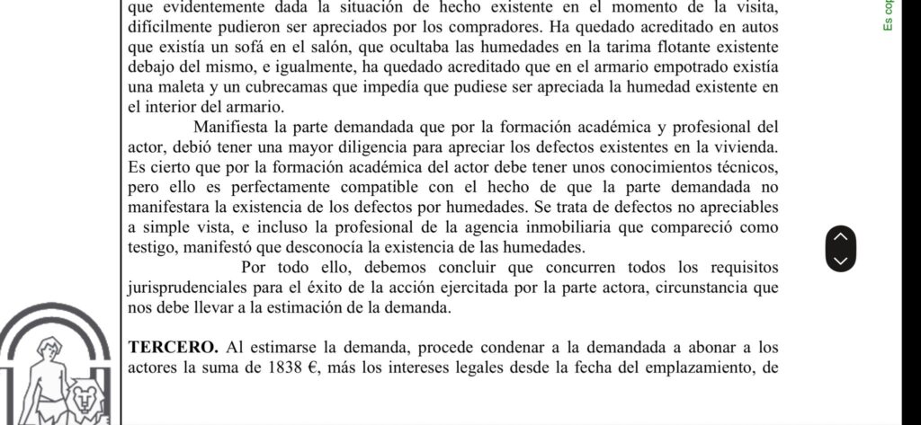 Pese a que nuestro cliente ostentaba el título de Técnico de la Edificación y, por tanto, en virtud del apartado 2 del citado precepto, el vendedor no tendría que responder en principio por los vicios ocultos (“si el comprador es un perito que, por razón de su oficio o profesión, debía fácilmente conocerlos”), el tribunal apreció que dicha circunstancia no era incompatible con la actuación de la parte demandada.